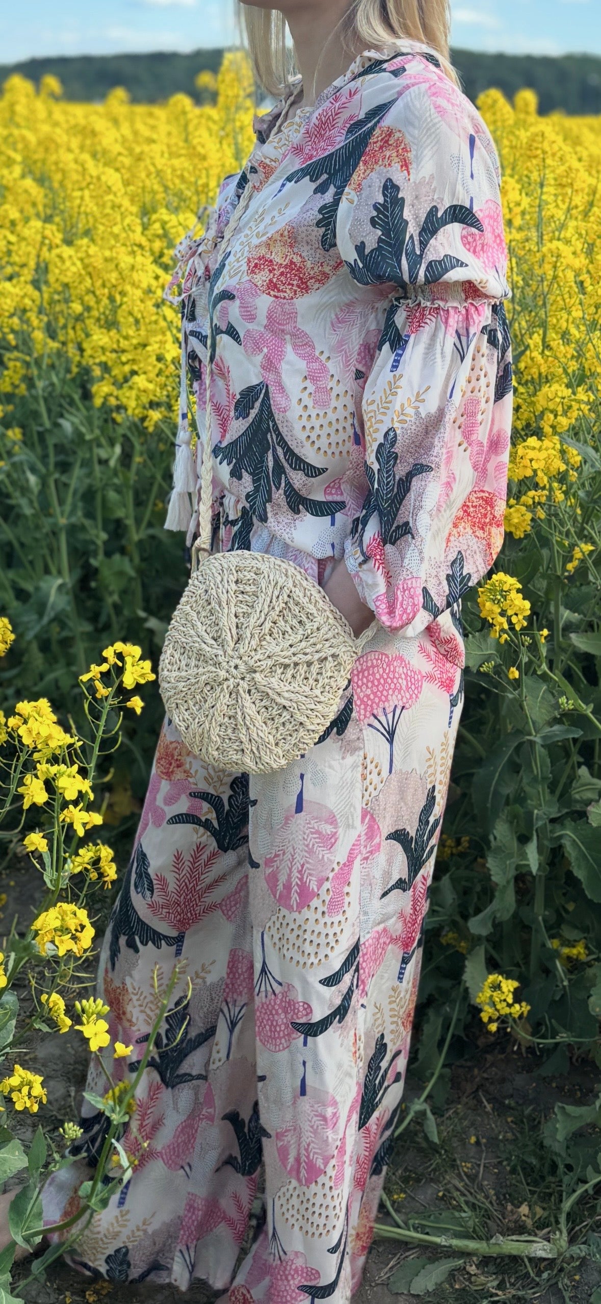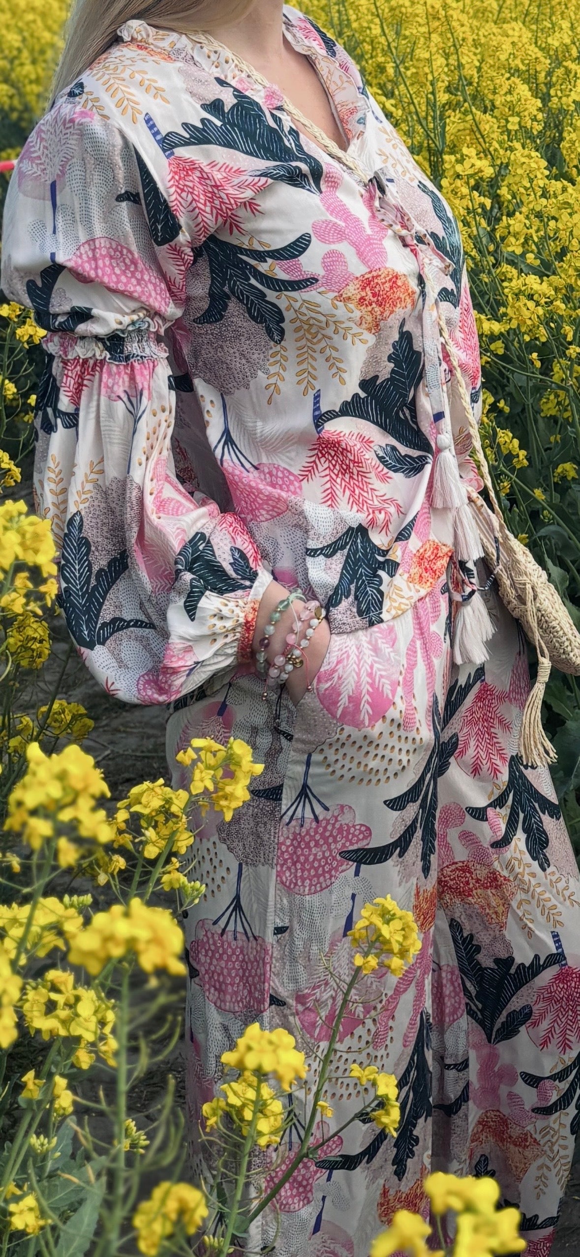 En vacker blus med lång ärm och smock detalj. Volang i ringningen och knyt band