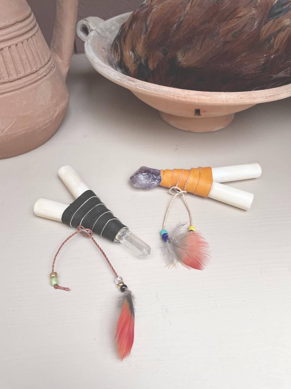 Handgjord Hapé självapplikator av ko-ben med läderband från Peru. Finns två varianter.