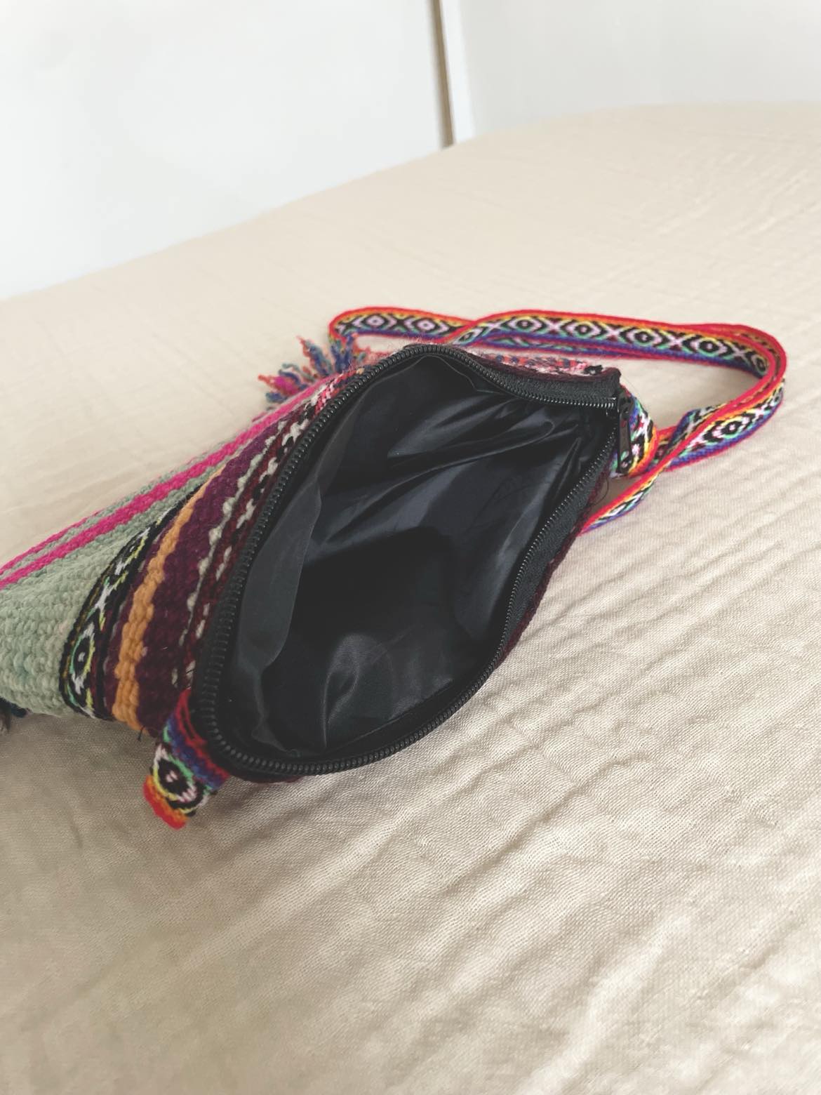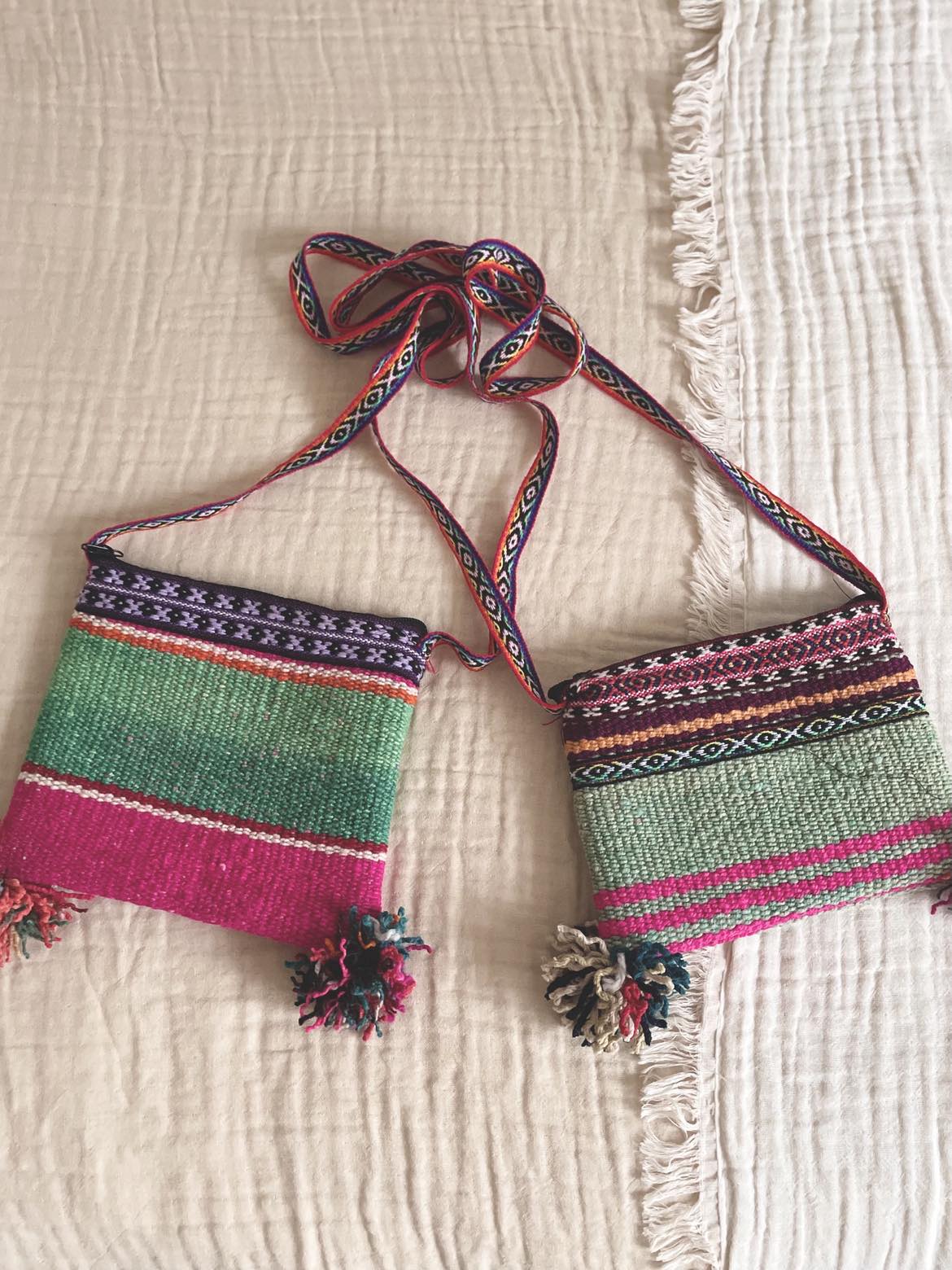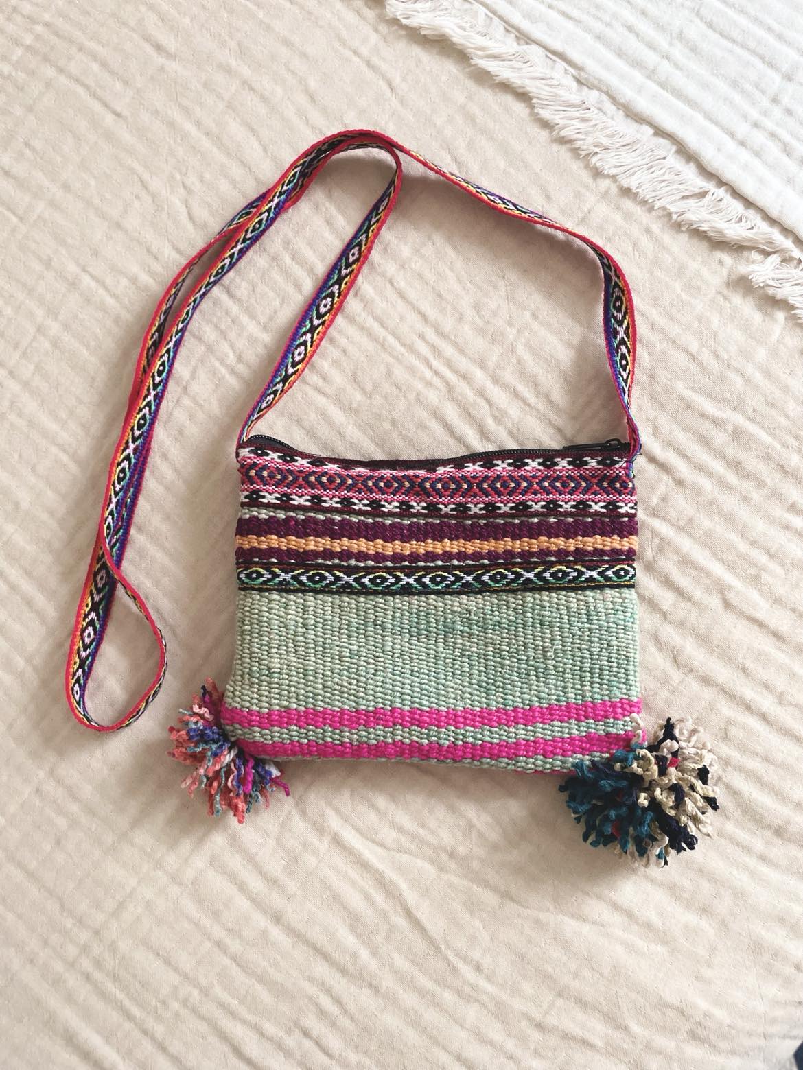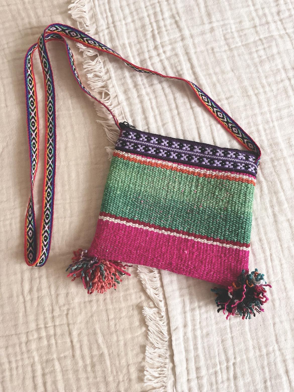 Mindre väska med axelrem, stickad i vackra färger från Peru. Alla unika