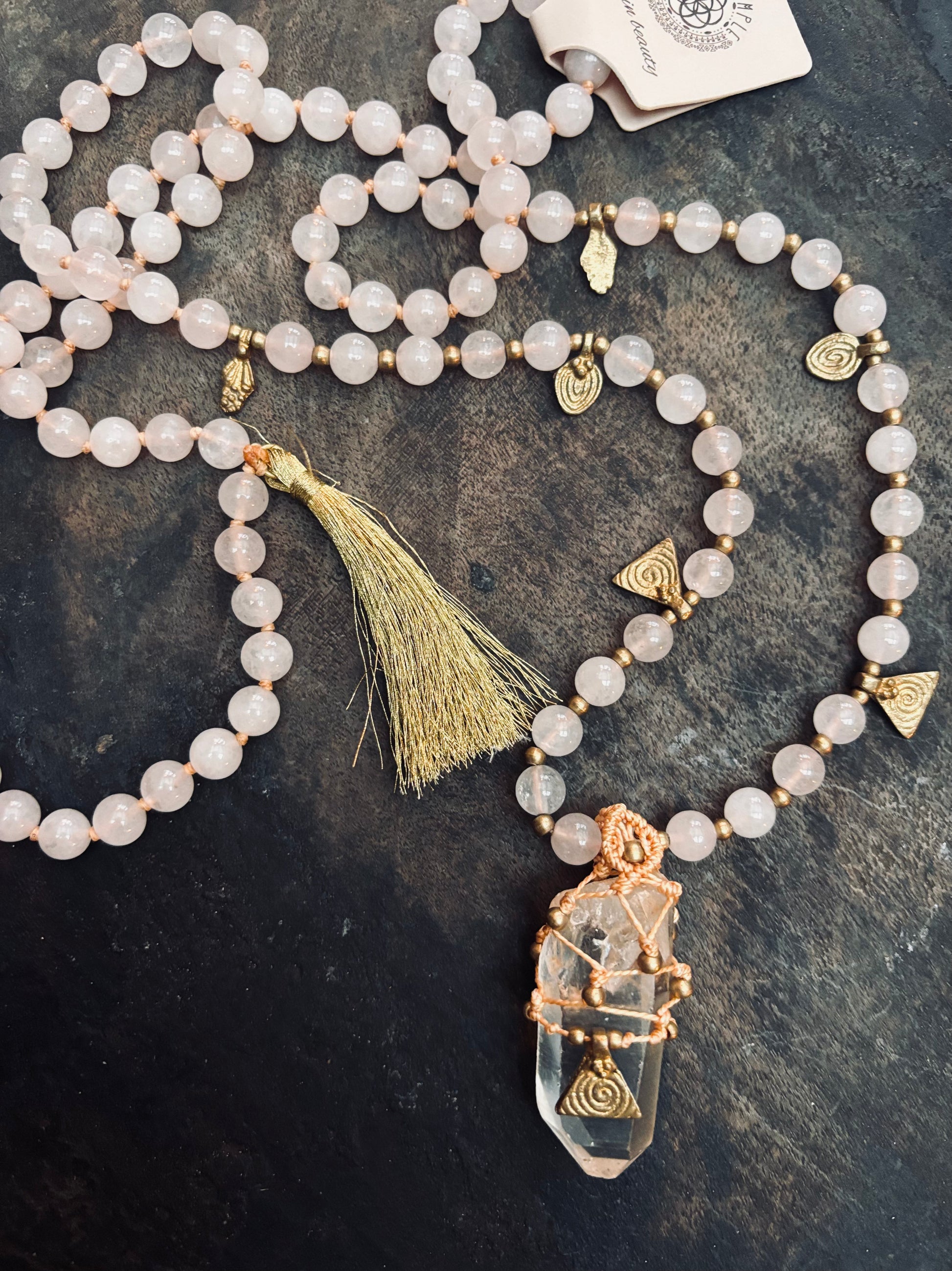 Denna Mala bär en mjuk, kärleksfull, feminin energi. Helar & öppnar upp hjärtchakrat. Rosenkvarts. Mässing. Bergkristall.