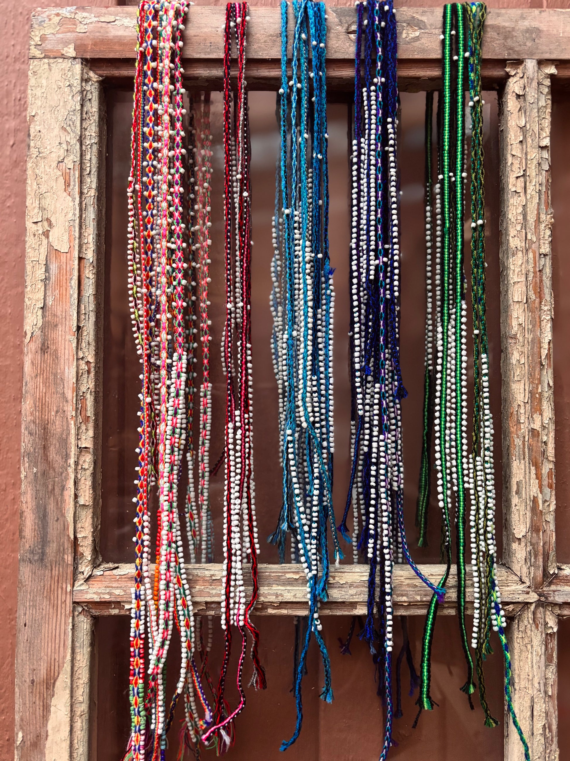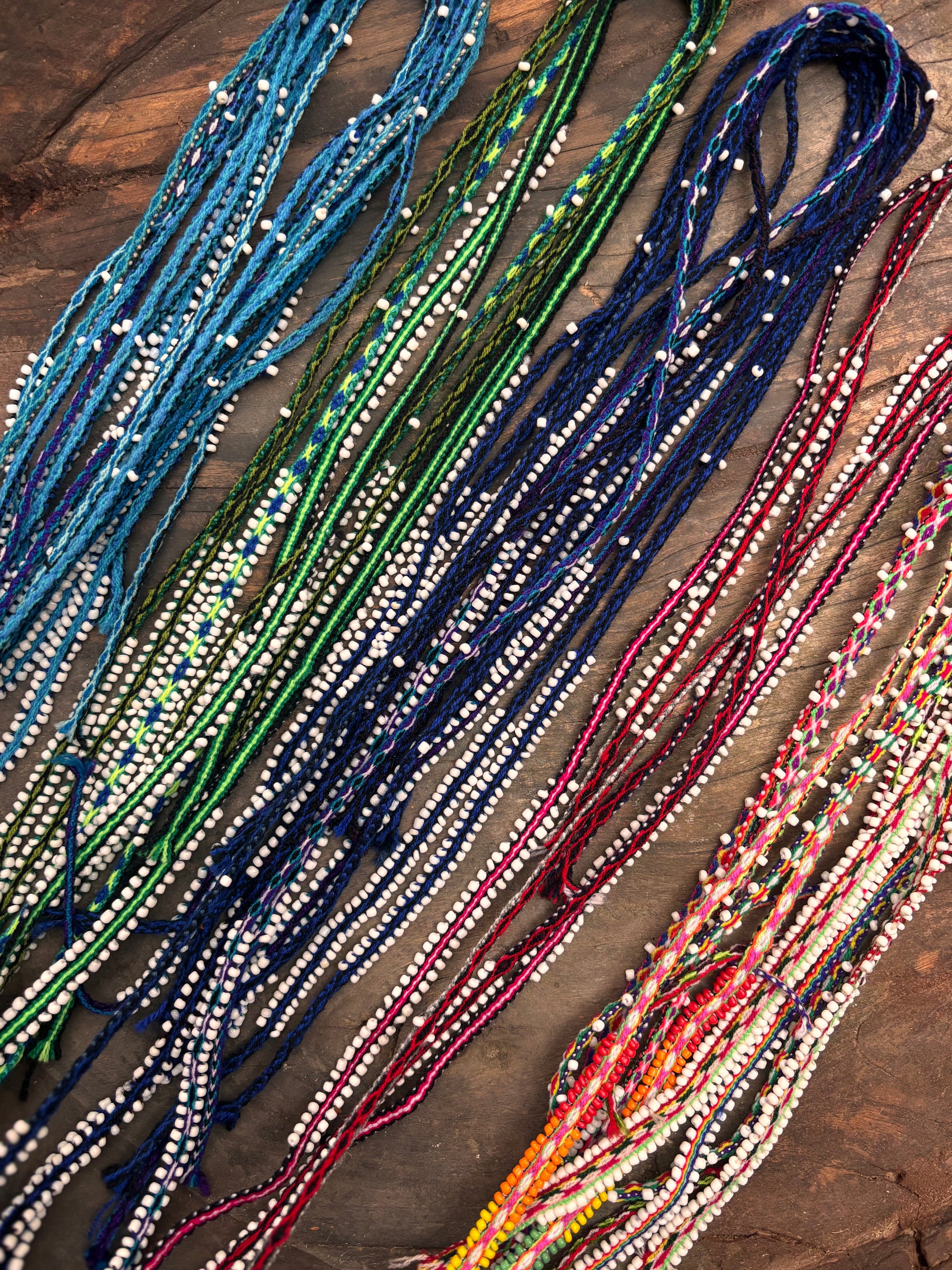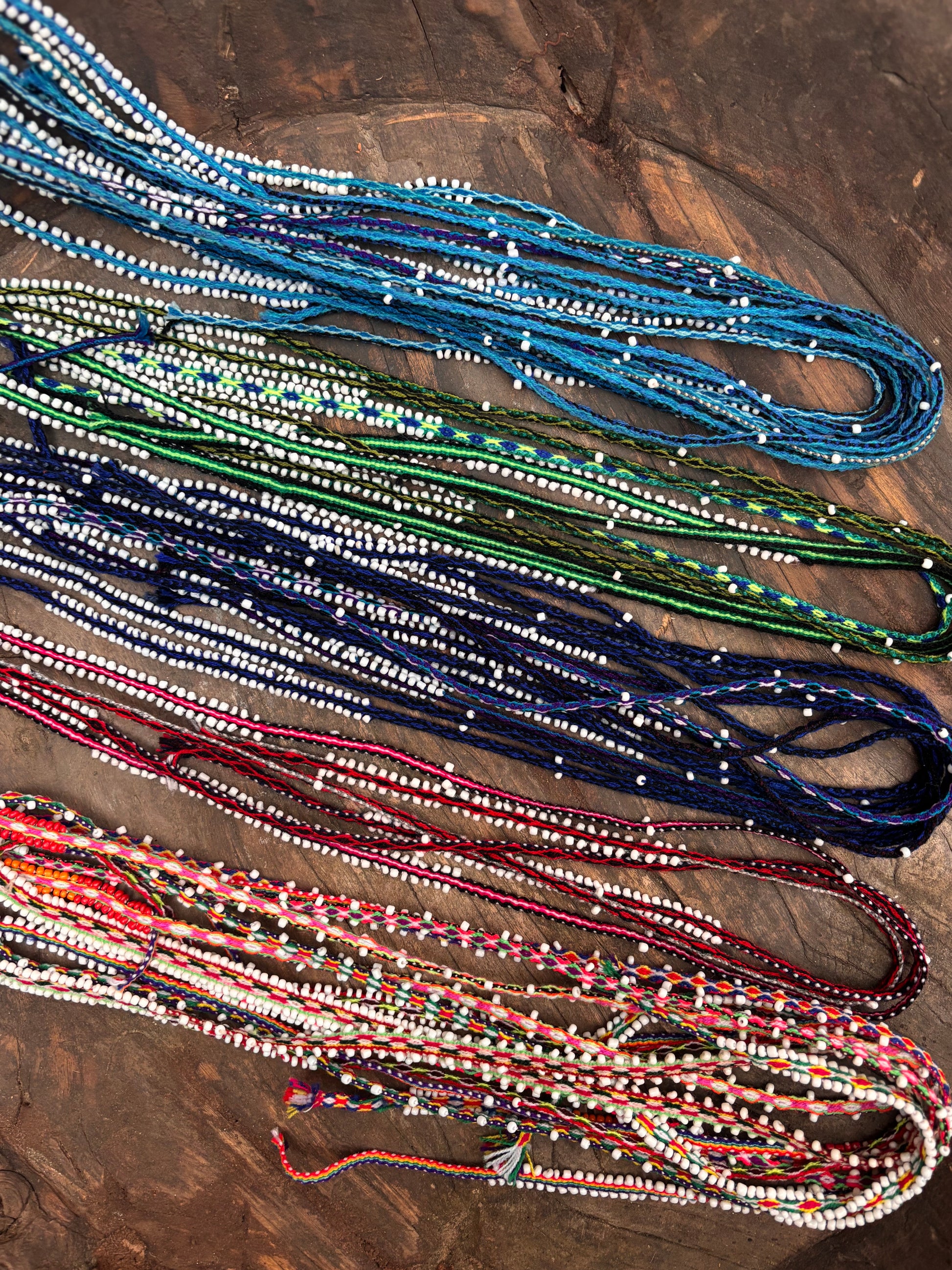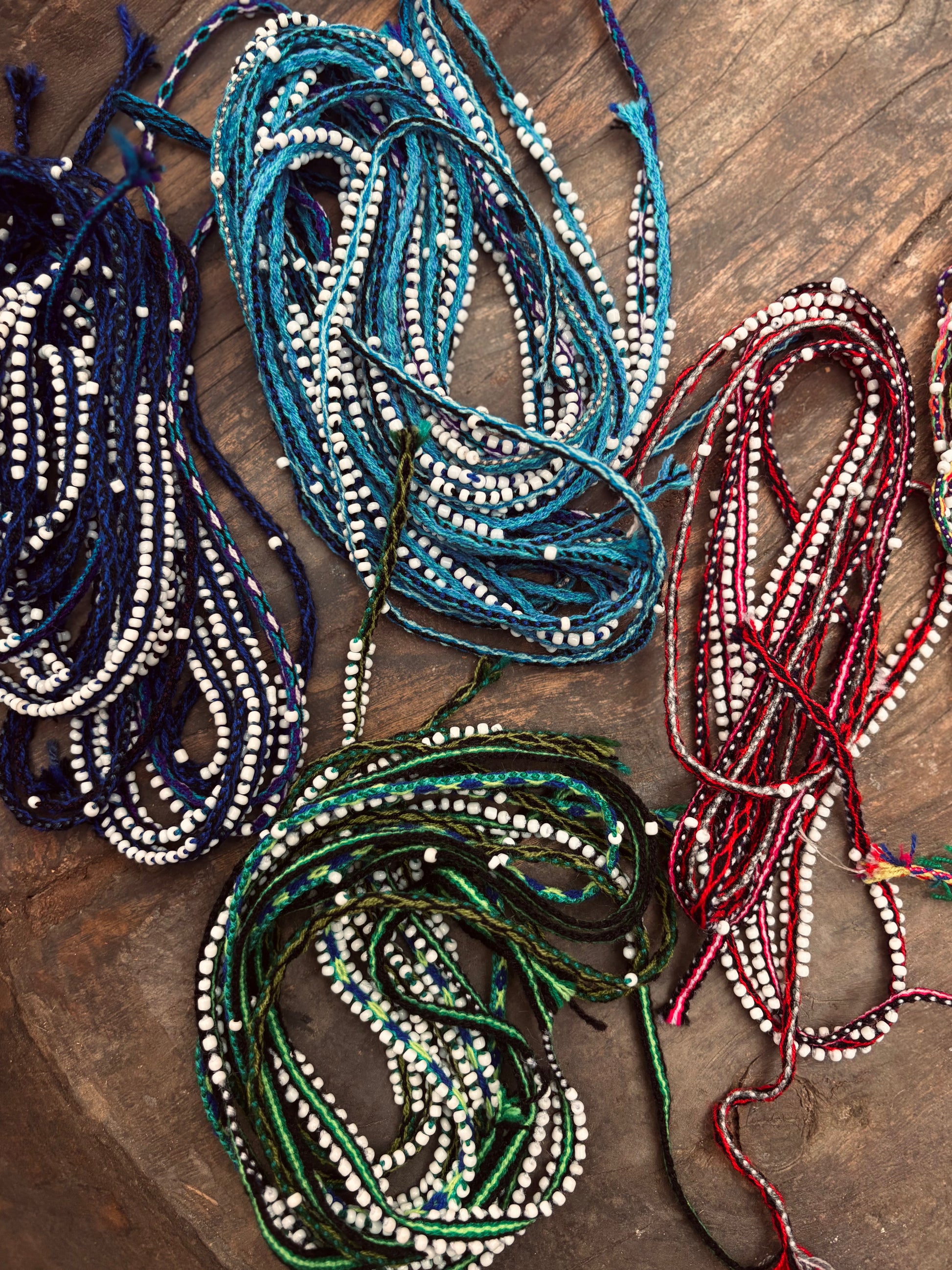 Dessa vackra mezaband är handgjorda i Peru och dekorerade med små pärlor i traditionella färger och mönster. Varje band bär spår av andinskt hantverk och skapas för ceremonier, altare och heliga föremål.