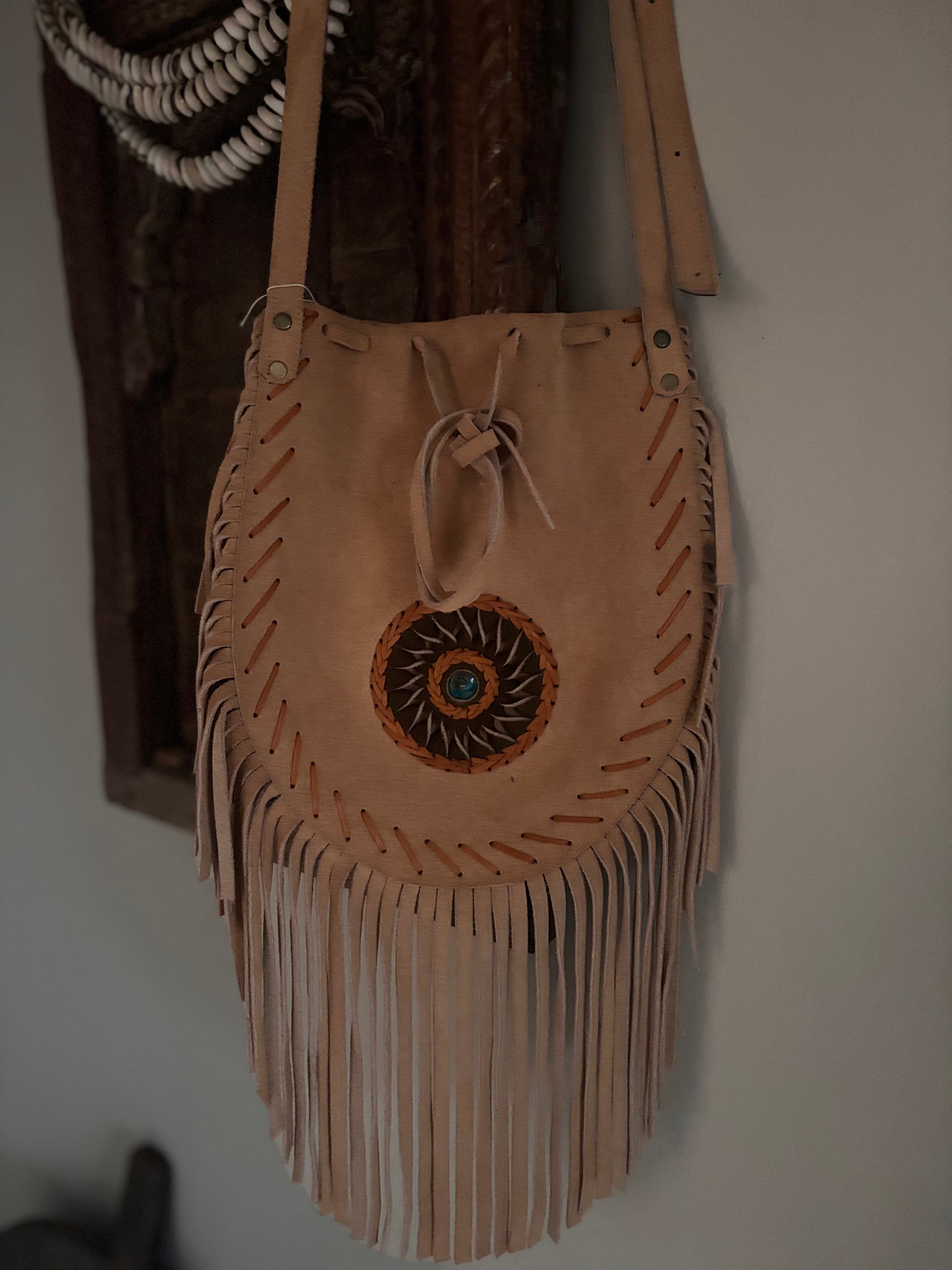 Varje del är formad för hand, från det mjuka lädret till de långa fransarna som ger väskan sitt kraftfulla, bohemiska uttryck. Justerbar axelrem.