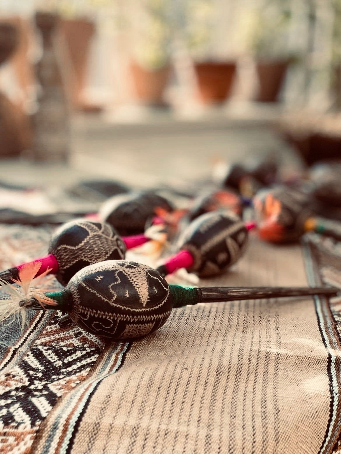 Tillverkade av naturliga material och dekorerade med olika symboliska motiv inspirerade av Andernas andlighet och naturens kraft.